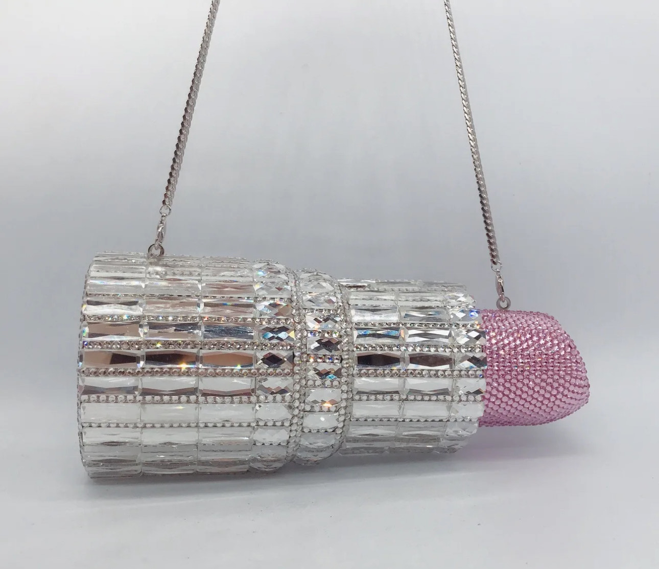 Make a bold and glamorous statement with our ‘Shimmering Luxe Lipstick’ handbag! This stylish and eye-catching accessory is a must-have for fashion-forward individuals who love to express themselves through their accessories. Shaped like a giant lipstick tube and covered in sparkling crystals, this handbag is a playful and chic interpretation of a classic beauty essential. Elevate your ensemble with a touch of whimsy and elegance with our ‘Shimmering Luxe Lipstick’ handbag.